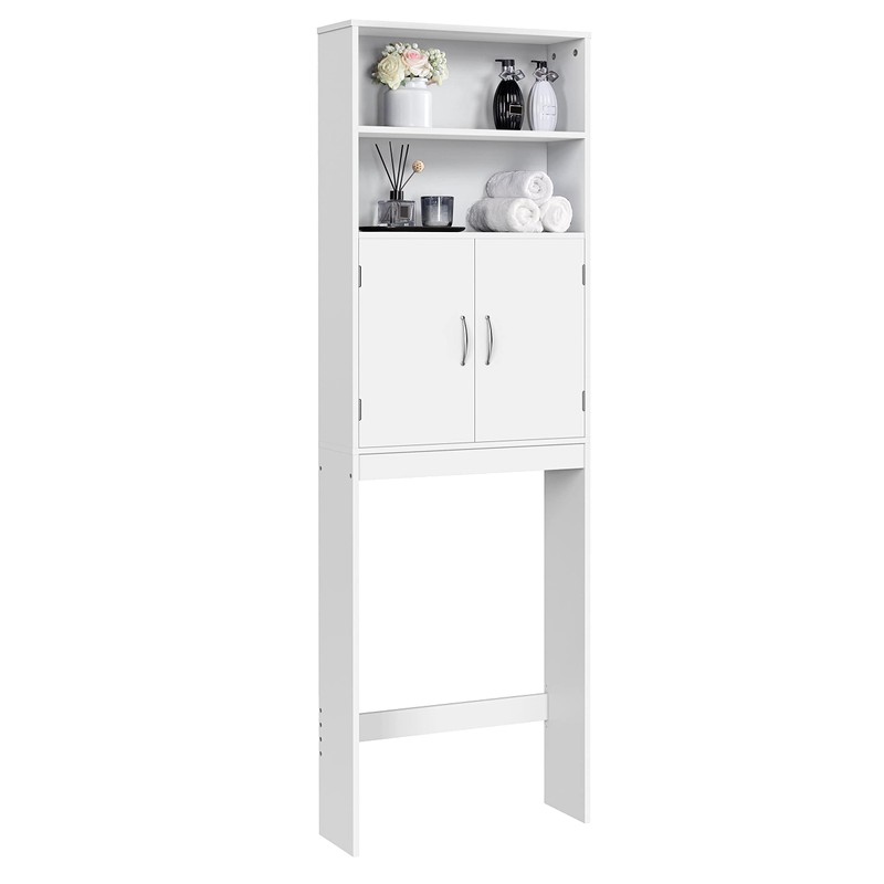 With this over-the-toilet storage tower, you can instantly expand your storage without sacrificing valuable floor space. Features one enclosed shelf with double doors, and two open shelves to place soap and other decorative items. Crafted of manufactured wood in a neutral finish, this charming design features two open cubby shelf perfect for storing candles, tissues, or rolled-up face cloths, while two doors open to reveal shelved cabinet storage for toiletries and bathroom supplies. Perfectly match any furniture in your house and make your home looking more elegant. Make use of wasted space with this space-saving storage unit.