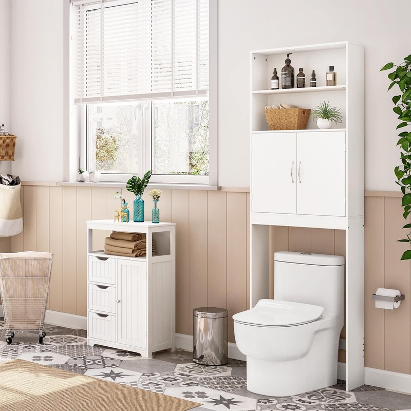 - Over the Toilet Storage: Gracefully create a casual aura in your restroom with an over-the-toilet storage cabinet perfect for storing all of your essentials. From essentials such as toilet paper, soap shampoos and towels, to decorations such as candles and succulents