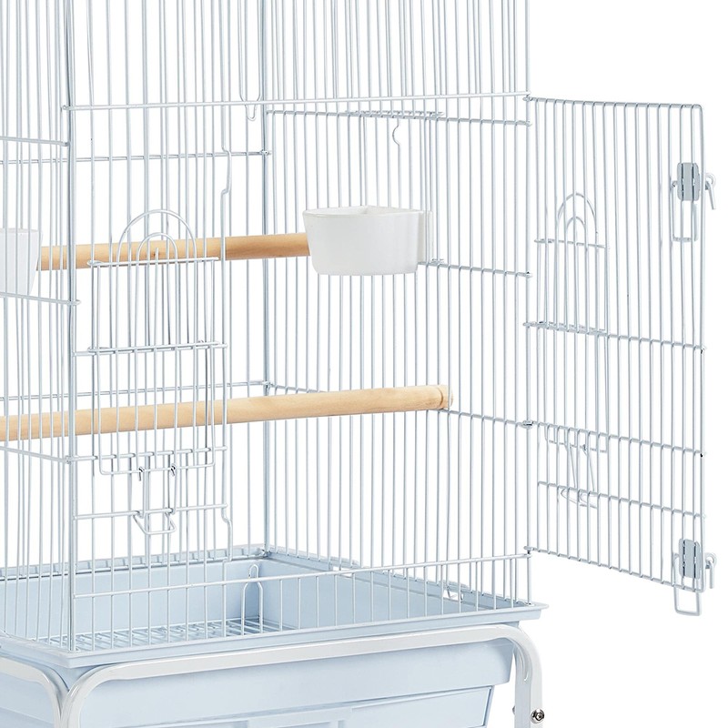 - Convenient feeding system: On the facade of this rolling bird cage are two feeding cups that can be accessed outside the cage through the small feeding doors. This convenient design helps easy bird seed refilling without disturbing your easily-scared friends.