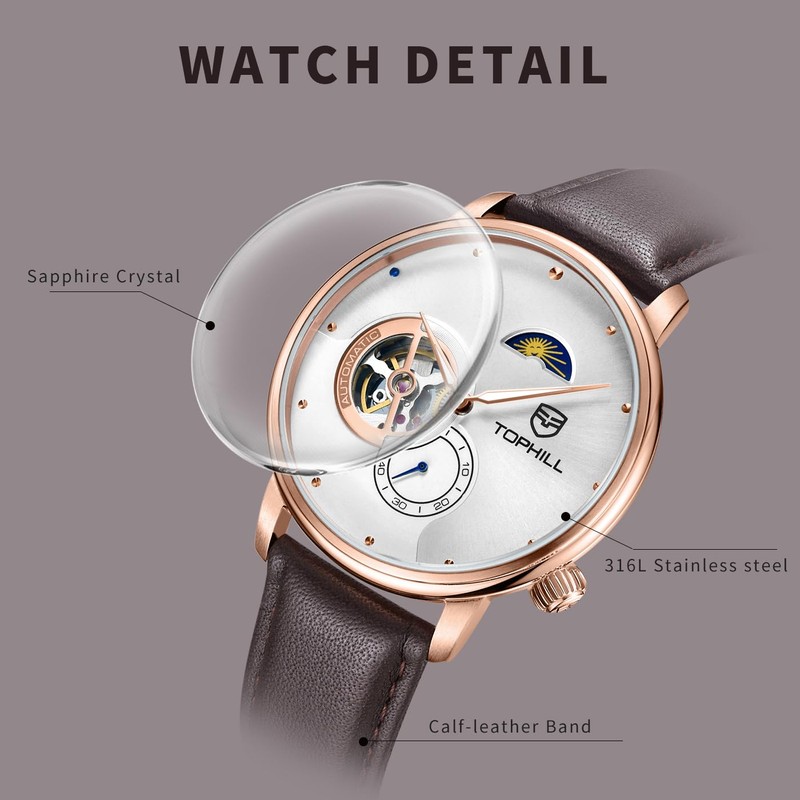 - Minimalist Men Watch: The TOPHILL Celestial Encounter Series features a refined white dial, the unique second window simplifies time display. And brown calf-leather strap ensures a comfortable fit and elegance, making it the ideal choice for modern gentlemen.