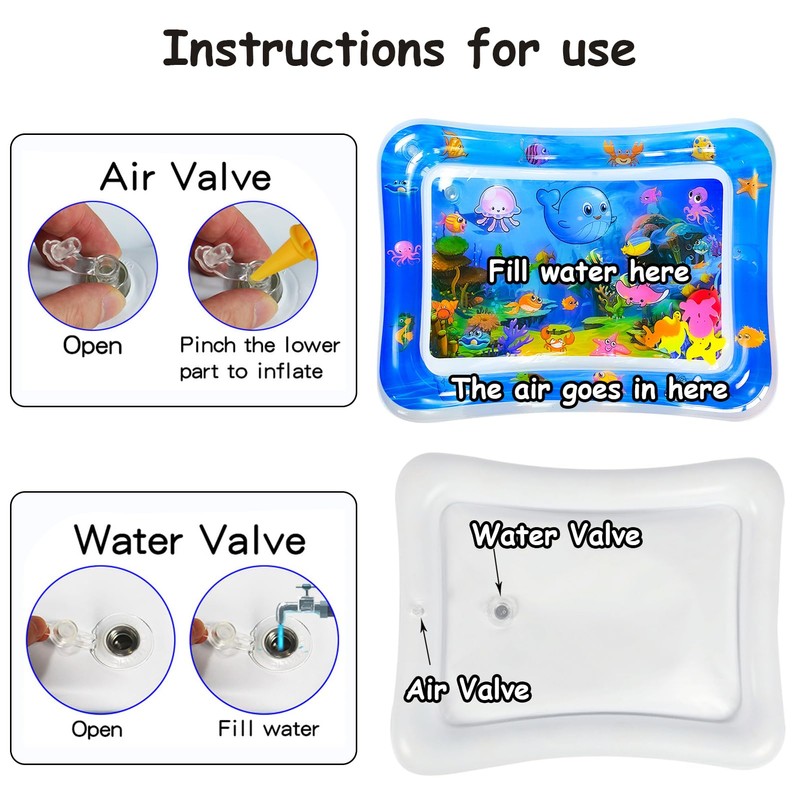 - Easy to Use Just fill water in the middle of the water mat and inflate the edge of the tummy time water mat with air. The water play mat is foldable, so you can easily store it when empty and take it anywhere.