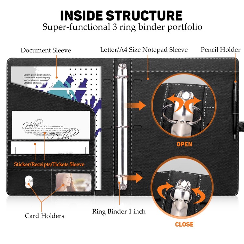 • 2.[High Capacity] Toplive portfolio folder 3 ring binder fits 8.5 by 11 inch letter size notepads and 3 ring hole punched notebooks, folder, and notebook paper. Another interior sleeve for loose documents or unpunched sheets.
