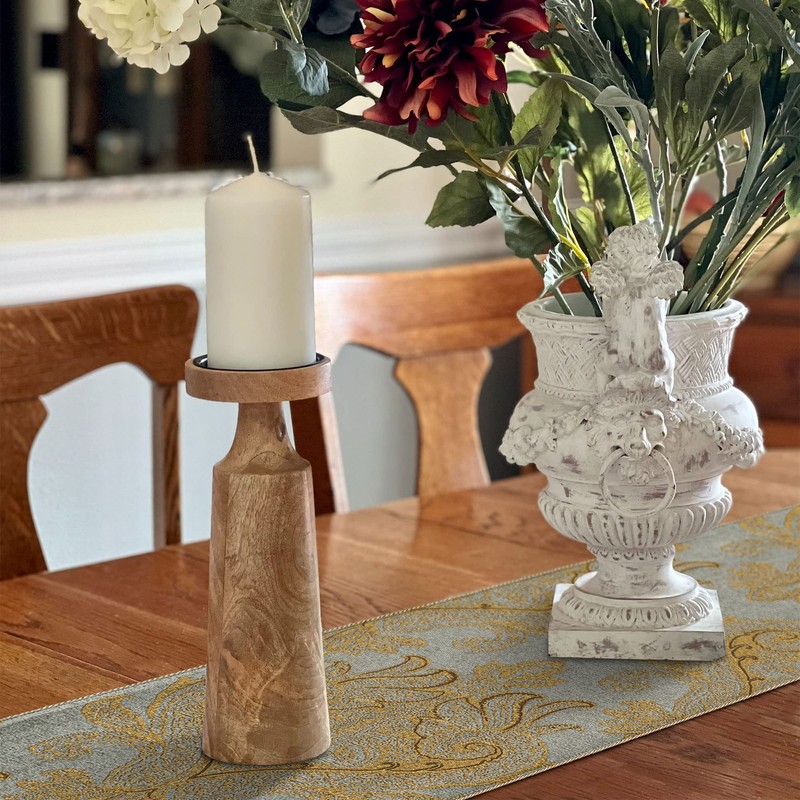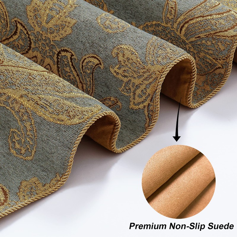 - ELEGANT DESIGN: The gold retro large patterns of this table runner perfectly modifies the light grey-blue chenille base fabric. In particular, the edge of this table runner is covered with light gold thread, which is more delicate.