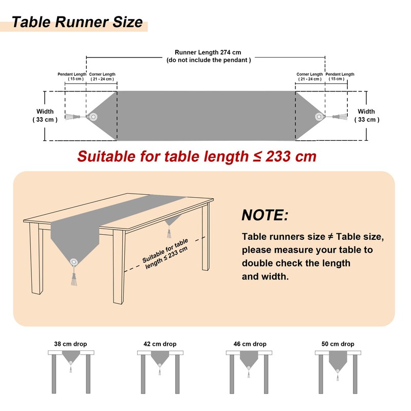 - DIMENSION: 33x274cm. The length of table should be less than 233cm. Placemats not included. Suitable for dining table, coffee table, TV cabinet, cupboard, etc. Great choice for decoring dining room, restaurant, party, banquet, and festival gathering.