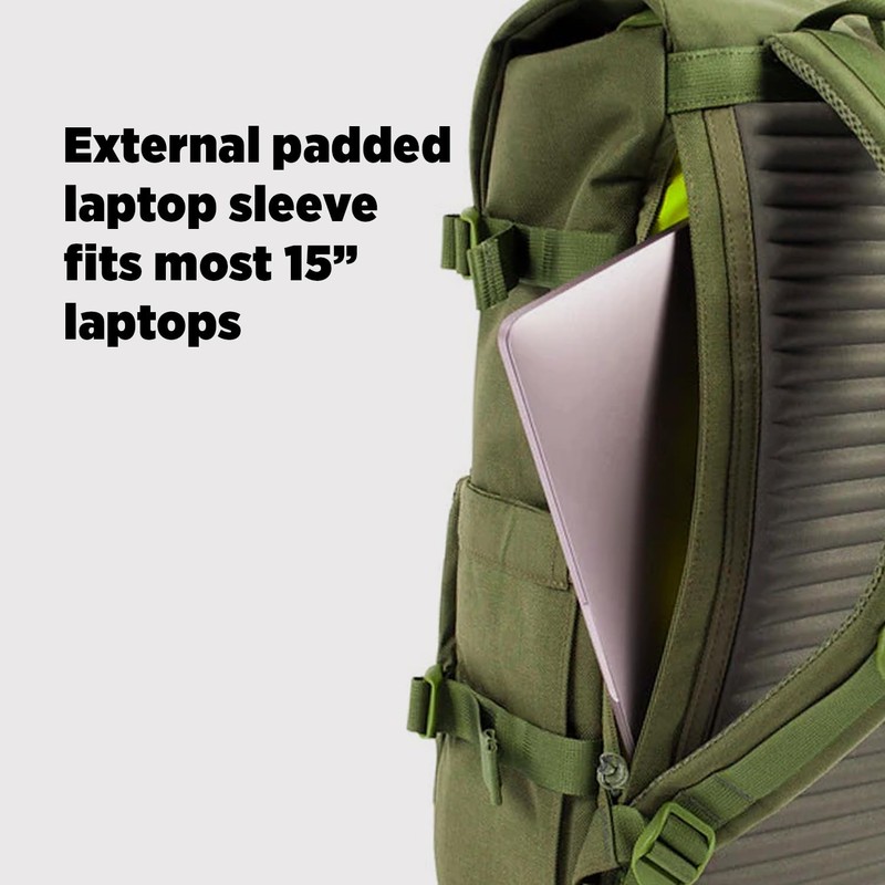 • BUILT FOR YOUR COMMUTE TO THE OFFICE: Constructed from 100% recycled nylon this everyday backpack features an external laptop sleeve, internal laptop sleeve, expandable bottle pockets, and a comfortable molded back panel