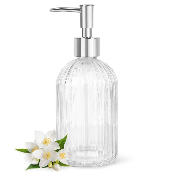 Topsky Stripe Glass Soap Dispenser with Plastic Pump, 400ml Liquid Hand Soap Dispenser, Rustproof Pump for Kitchen & Bathroom, Great for Lotions, Essential Oil, Liquid Soaps,Transparent