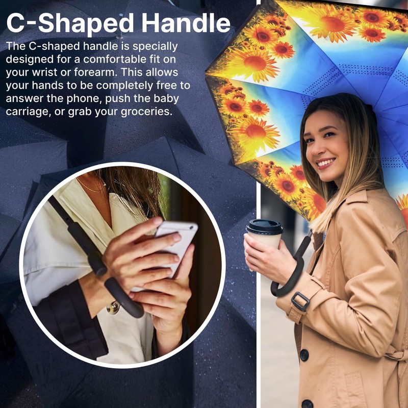 • C-SHAPED HANDLE for HANDS-FREE USE. The ergonomic C-shaped handle allows you to slip it over your wrist, freeing your hands for multitasking. Whether you're holding groceries, pushing a stroller, or texting, this design offers ultimate convenience and comfort while staying dry.