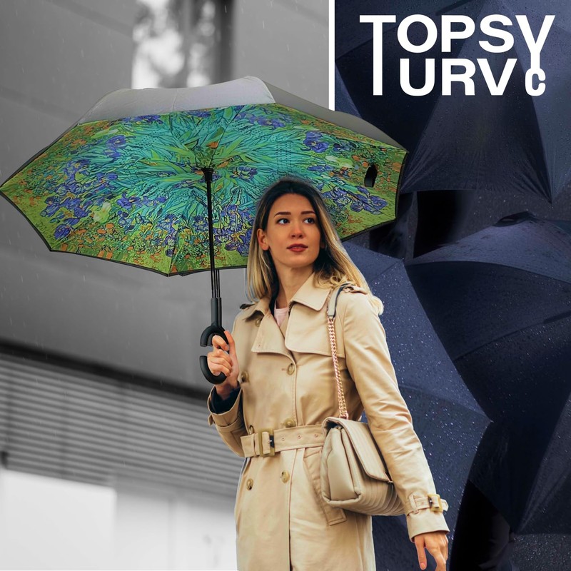 • INNOVATIVE. The Topsy Turvy umbrella folds in reverse, so the wet surface is kept inside when closed. This unique feature prevents water from dripping onto your clothes, car seats, or floors, making it ideal for indoor spaces and vehicles.