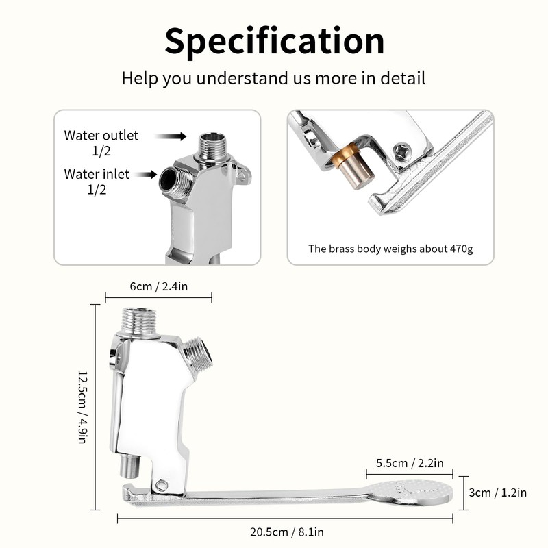 - Easy Installation and Maintenance: Featuring G1/2 threaded inlet and outlet pipes, this foot pedal faucet ensures quick and hassle-free installation and disassembly. This user-friendly design allows for convenient cleaning and ensures optimal sanitation standards. Say goodbye to complicated setups and laborious maintenance tasks with this efficient and practical solution.