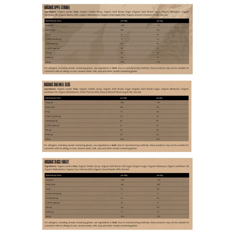 - Bundle that includes 6 x 65g Torq Flapjacks; 1 x Banana Cake, 1 x Black Forest, 1 x Bakewell Slice, 1 x Apple Strudel, 1 x Ginger Cake, 1 x Carrot Cake, packaging in an exclusive branded box.