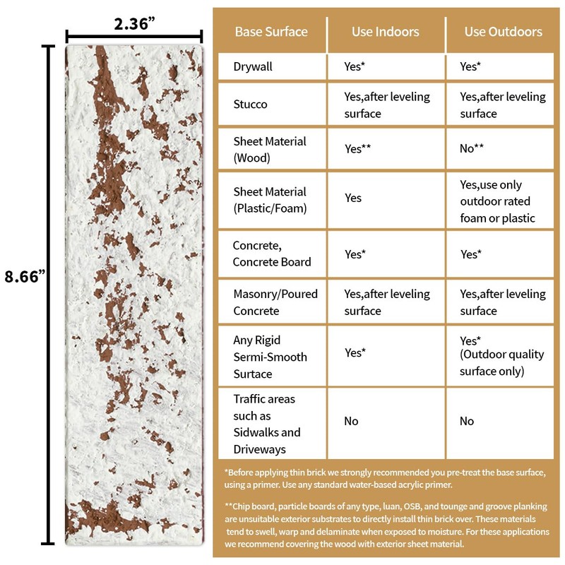 • Made from durable inorganic mineral powder and poly-acrylic binder, with a matte texture finish. The thin brick veneer is flexible and can be used on curved walls. NOTE: it is recommended to spray primer on the brick surface to avoid stains and oil if used in the kitchen.