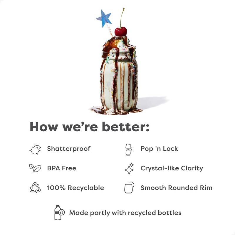- Each glass is made from up to 2 recycled plastic bottles and is 100% BPA-Free.