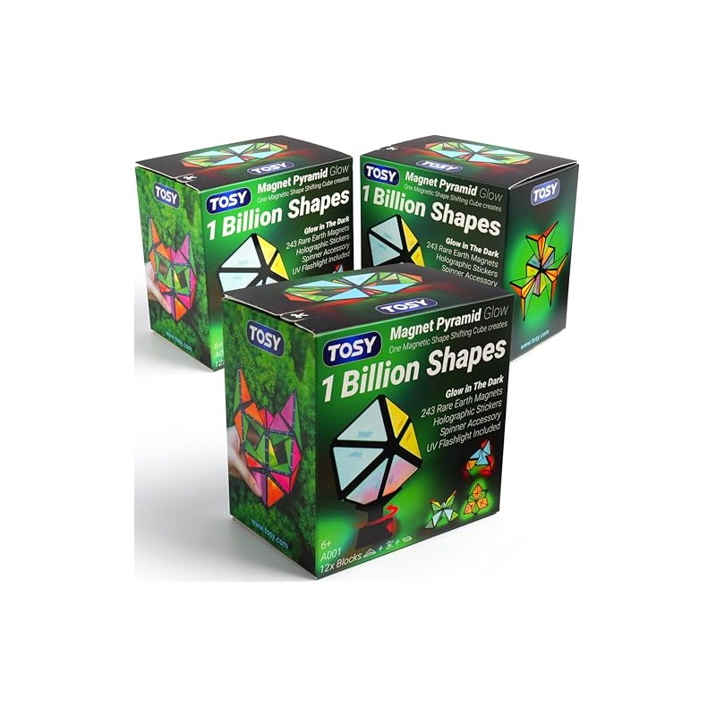 TOSY Magnet Pyramid Glow - 1 Cube Transforms into 1 Billion Shapes, 12 Pieces, 243 Rare Earth Magnets, Glowing, Holographic Design Magnet Tiles Creative Puzzle STEM/STEAM Toy, 3-Pack