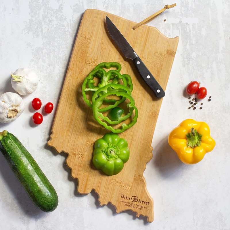 Totally Bamboo Indiana State Shaped Cutting Board and Charcuterie Serving Platter with Artwork by Fish Kiss, Includes Hang Tie for Wall Display