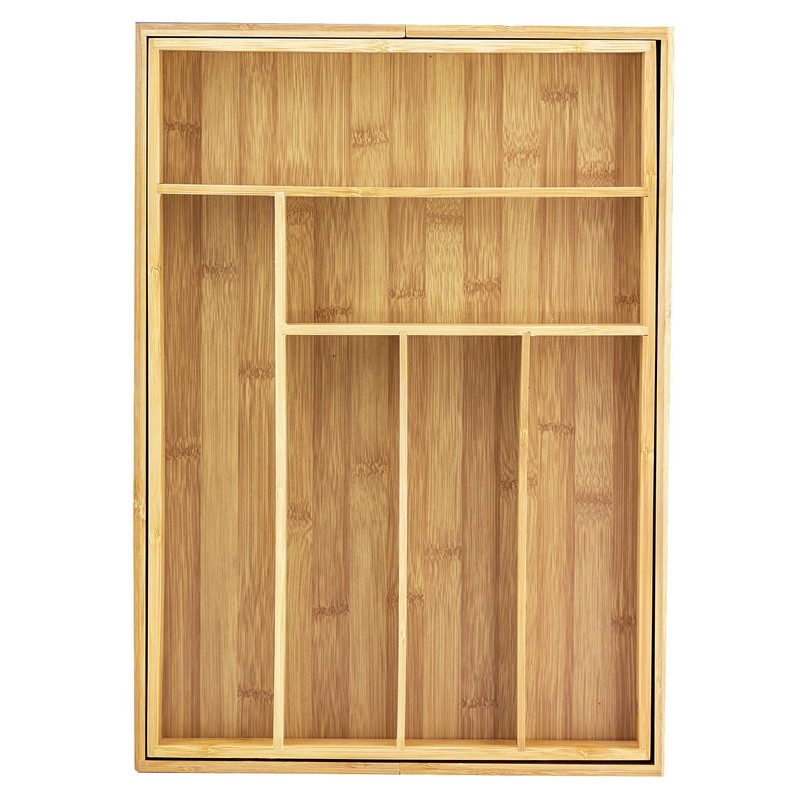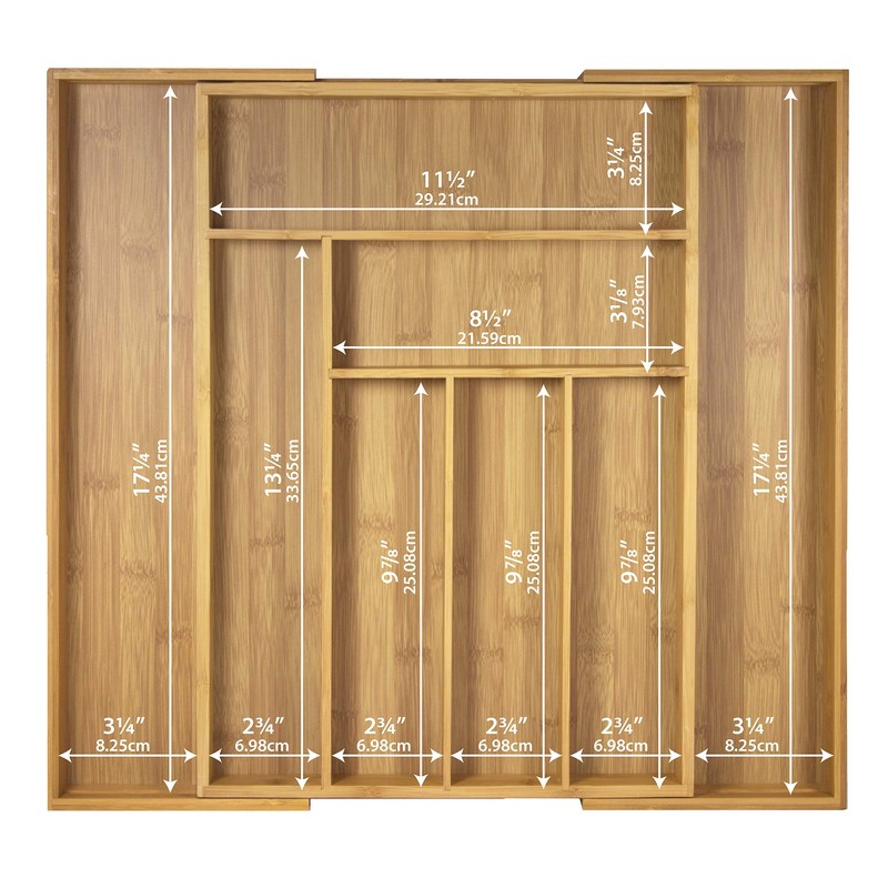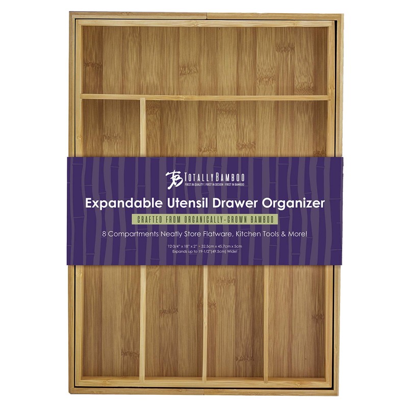 Keep drawers neat and organized while easily tracking down what's needed with the Totally Bamboo Expandable 8-Compartment Drawer Organizer. The sliding side compartments of this organizer are ingeniously designed to expand to fit any drawer, from 12-3/4 inches up to 19-1/2 inches. The varying sized compartments work well in the kitchen or anywhere else in the home or office. Whether storing flatware and cutlery, office and stationary supplies or crafting and sewing materials, this organizer will keep things straight. The organizer is made of a combination of materials for best long-term results: sturdy bamboo for the dividers and a fiberboard base to provide a solid foundation. It's easy to keep the organizer clean too; just wipe clean with with a damp cloth and soap. Backed by a one-year manufacturer's limited warranty.