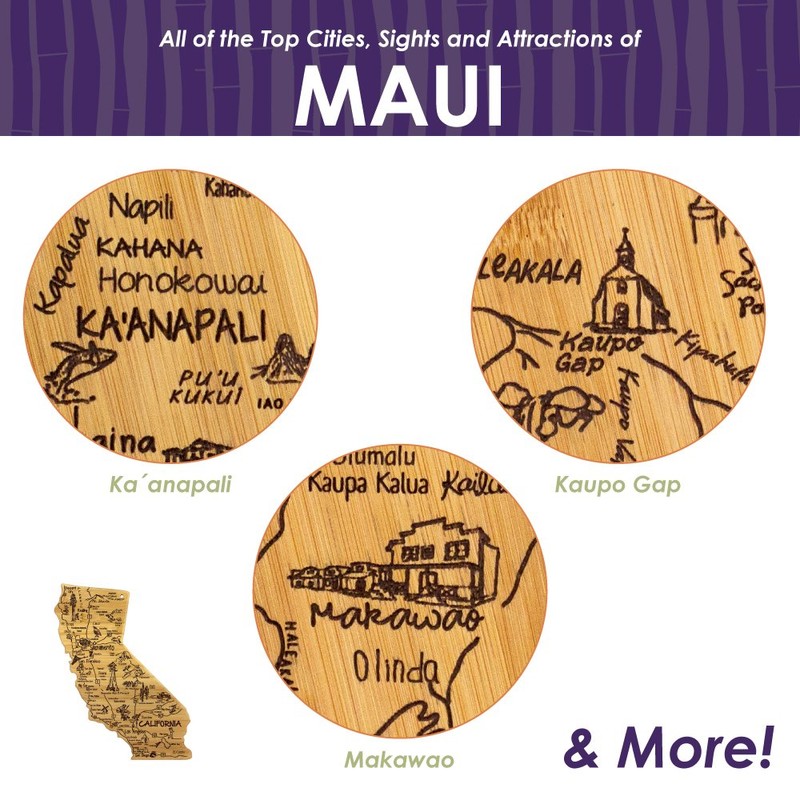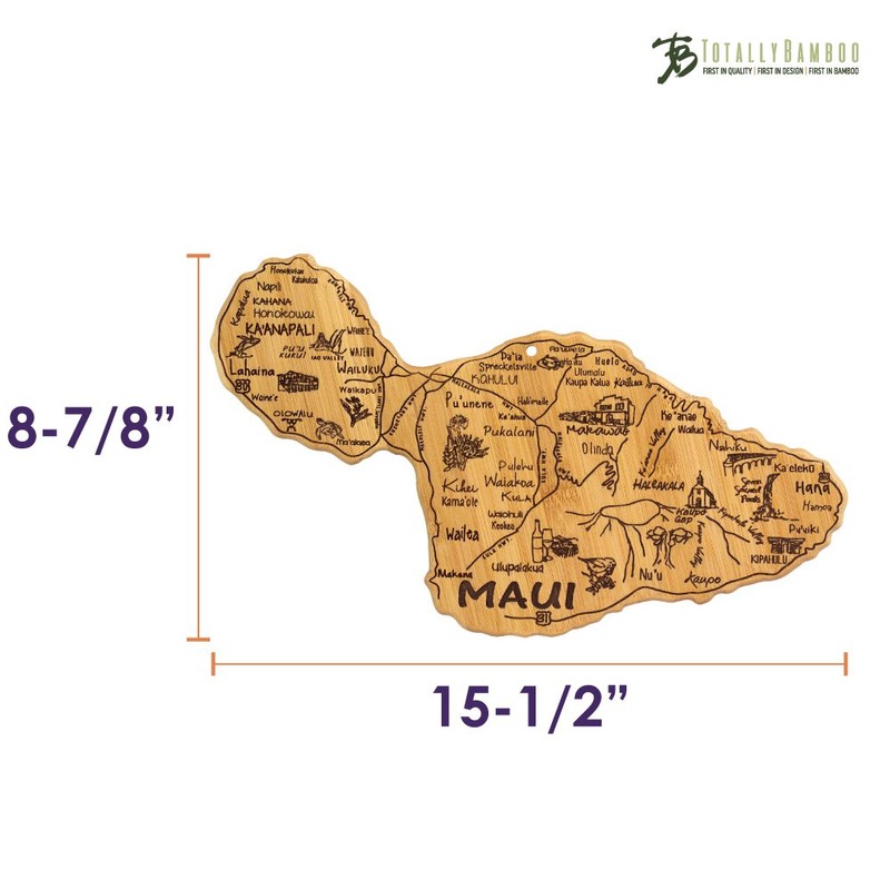 - Celebrate life on "The Valley Isle" with this beautiful bamboo cutting board in the shape of Maui island with permanent, laser-engraved artwork