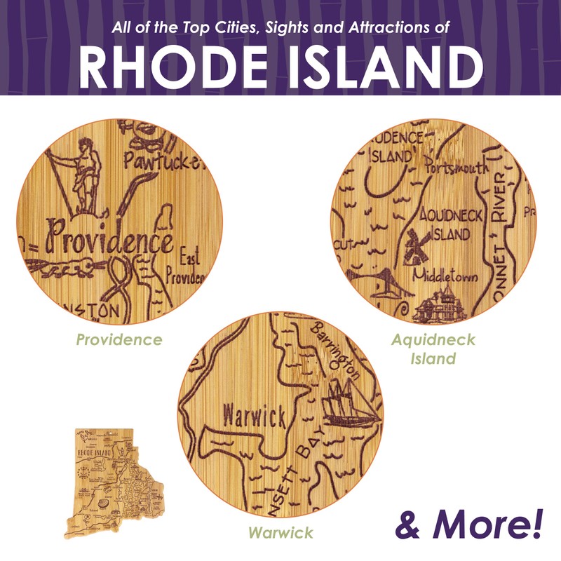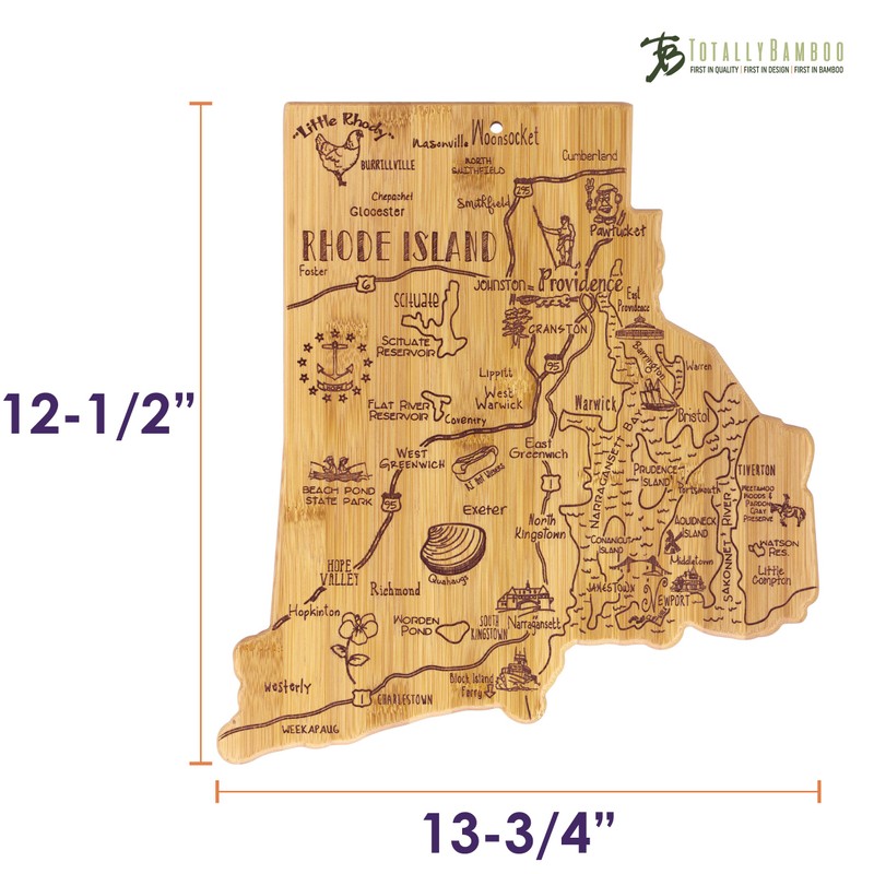 • Fun, whimsical laser-engraved artwork calls out all the wonderful sights and places in the state from Providence to Block Island, Pawtucket to Weekapaug, Aquidneck Island to Worden Pond and much more; board measures 13-3/4" x 12-1/2" x 5/8"