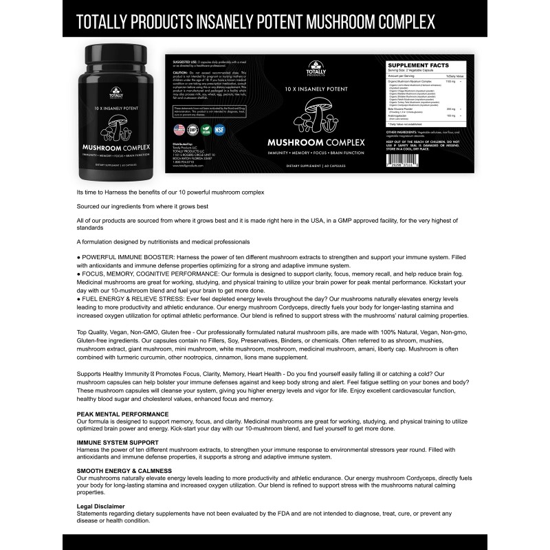 Totally Products Mushroom Complex Support Immune System & Cholesterol Control Heart Supplements