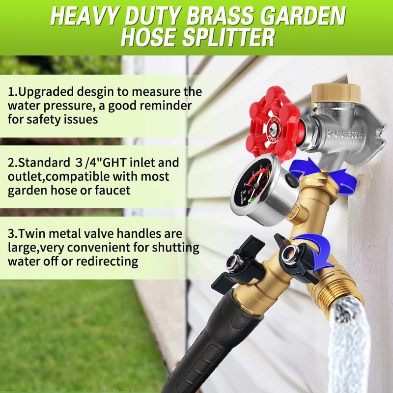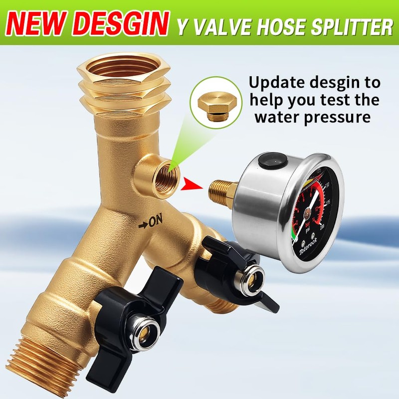 - [NEW DESIGN] We introduced an innovative design by adding a small auxiliary hole on this 2 way hose splitter which aims at helping you mitigate potential safety risks .This design improvement enables intuitive measurement of dynamic water pressure while maintaining the structural integrity of the equipment.