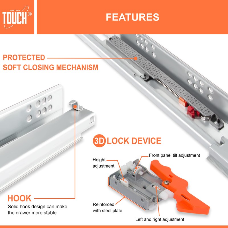 - Kitchen drawer rails: Undermount slides 3D Adjustable Lock Device to fine tune. The concealed drawer glides are rated for heavy-duty use (loads up to 75 lbs.), featuring Soft-Close functionality to ensure the drawer close softly and silently.
