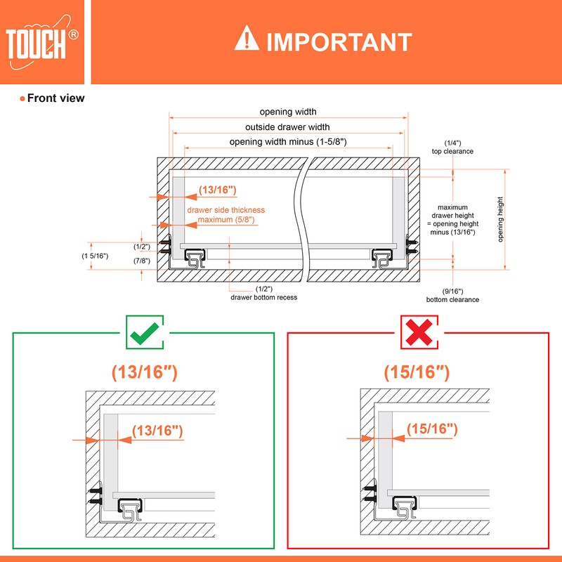 - Important: Please read the specifications carefully before purchase. The inside drawer width must equal cabinet opening width minus (1-5/8") to align and function optimally. Fits for 1/2" and up to 5/8" thickness of drawer side panel. ** for face frame applications, rear mounting sockets are required (sold separately) **.