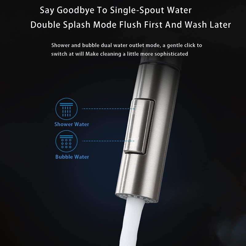 - High-Arch Spout Design: 360 degree swivel sprayer and spout with 2 function Spary, The Shower mode water outlet and Air bubble mode water outlet mode Two cleaning modes can be switched by key, which can meet your different needs.Provides flexibility and convenience for washing food . which will be more convenient for your daily use.