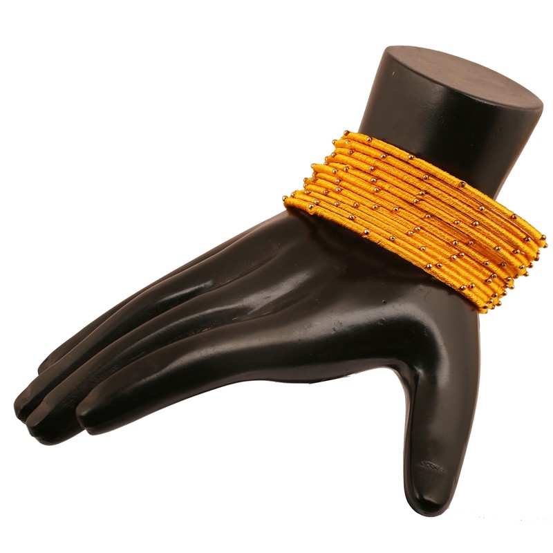 Touchstone "Silk Thread Bangle Collection Indian Bollywood Handcrafted Faux Silk Thread with Golden Beads Exotic Look Fire Yellow Designer Bangle Bracelets Set of 12 for Women.
