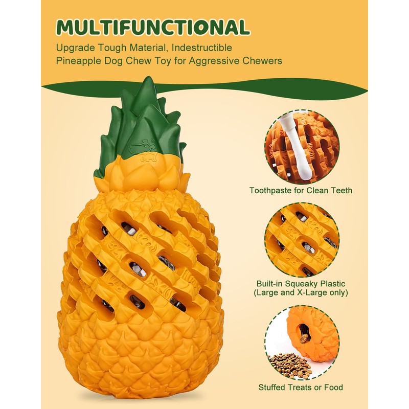 - π Squeaky Treat Dispensing Dog Toy: The pineapple dog toy is a hollow toy with a hole at the bottom for placing dog treats. The toy has small holes on the sides that allow the food to leak out, enticing the dog's interest. In the Large toy and X-Large toy, there is also a squeaky toy inside, providing dogs with a dual sensory experience of taste and sound, making them even happier.