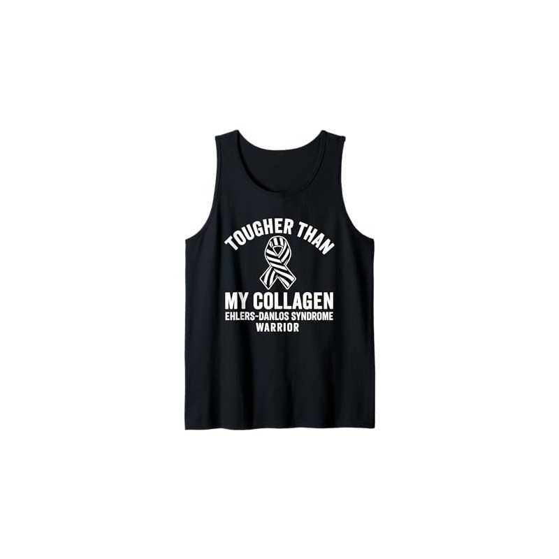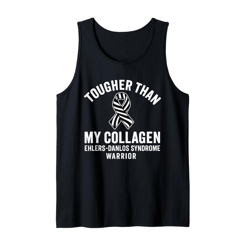 - Show your strength with this empowering “Tougher Than My Collagen – Ehlers-Danlos Syndrome Warrior” design. Featuring a bold zebra-striped awareness ribbon and resilient typography, it’s great for those living with EDS who push through pain with power.