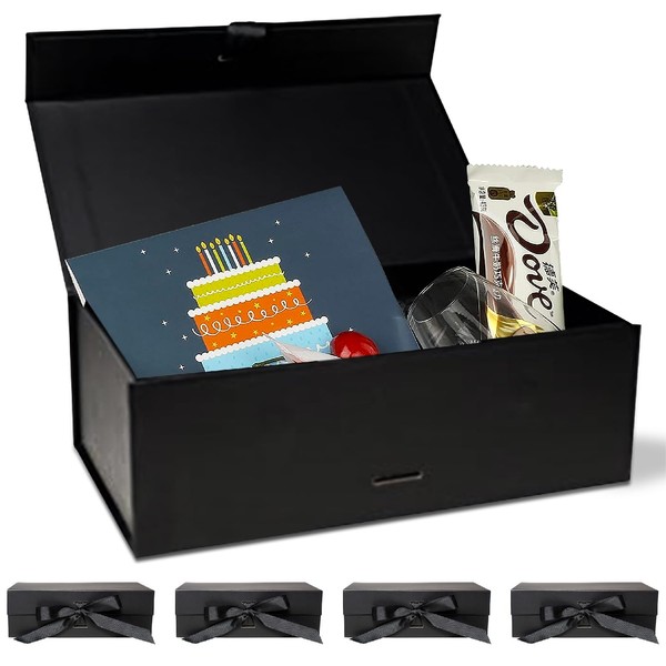 - UNIQUE DESIGN: This black cardboard box has a magnetic lid, allowing the box/gift box to be closed without extra tape. The black box is collapsible, allowing the user to store it easily. Not only that the box has a magnetic lid or collapsible, but it is also made with a plain black ribbon for gifts for your friends or family members.