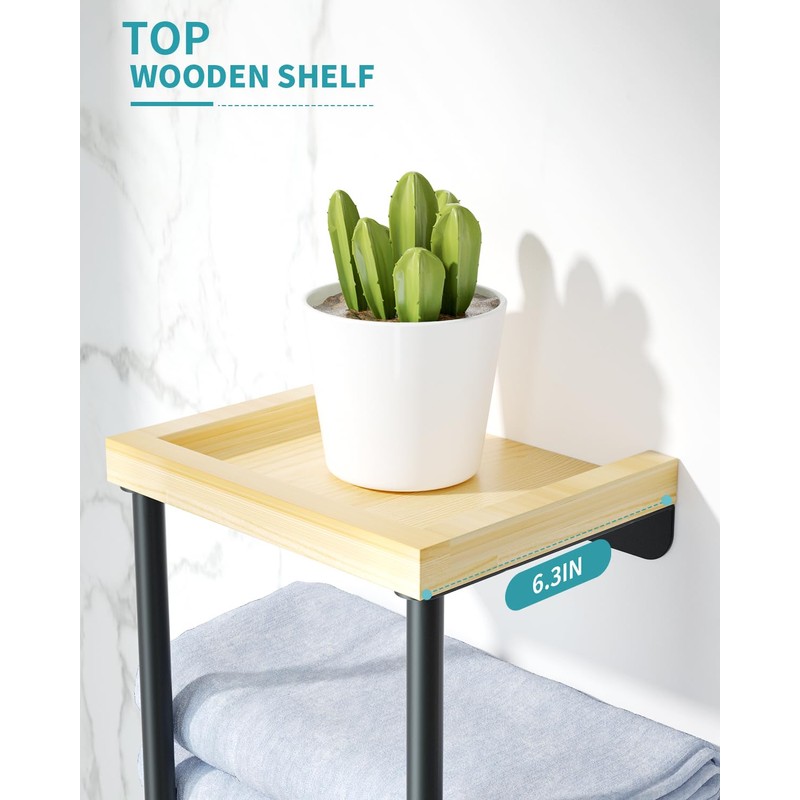 - Sturdy and Durable: Our bathroom shelves is mainly made of high quality metal, which is strong and durable, you don't have to worry about the bathroom towel holder getting bent. The top adds a wooden shelf to greenery or other decorative items, space saving.