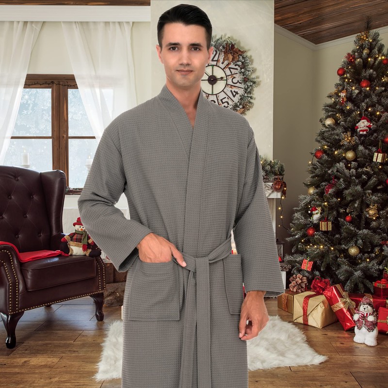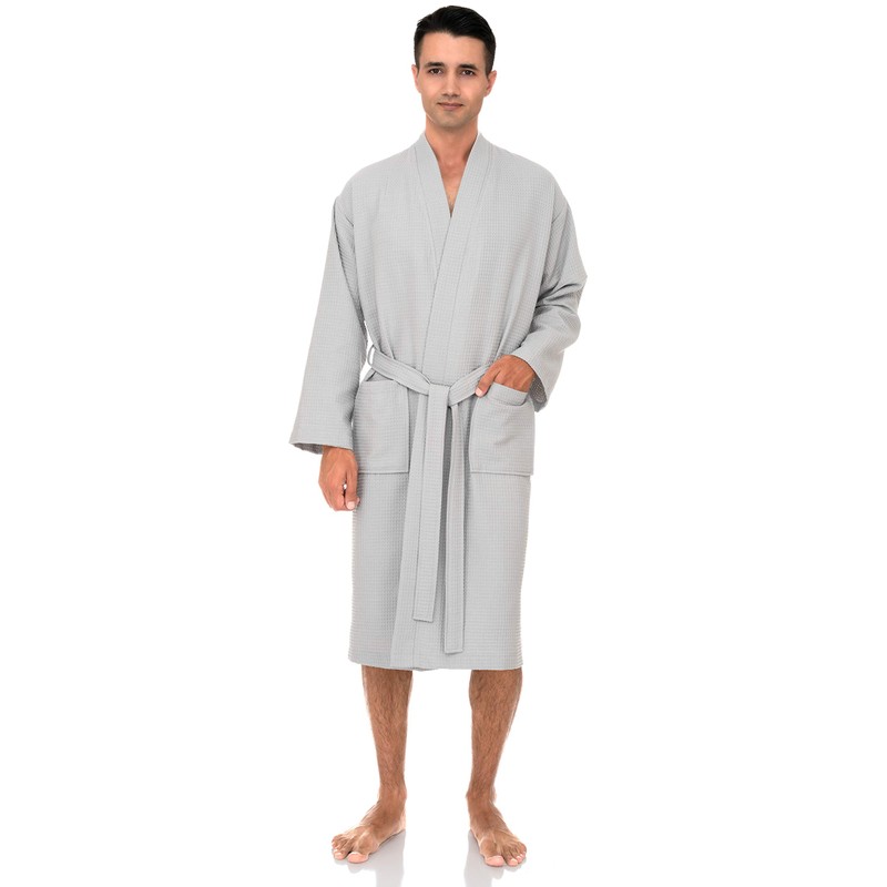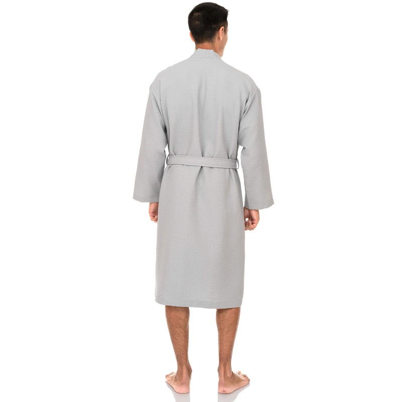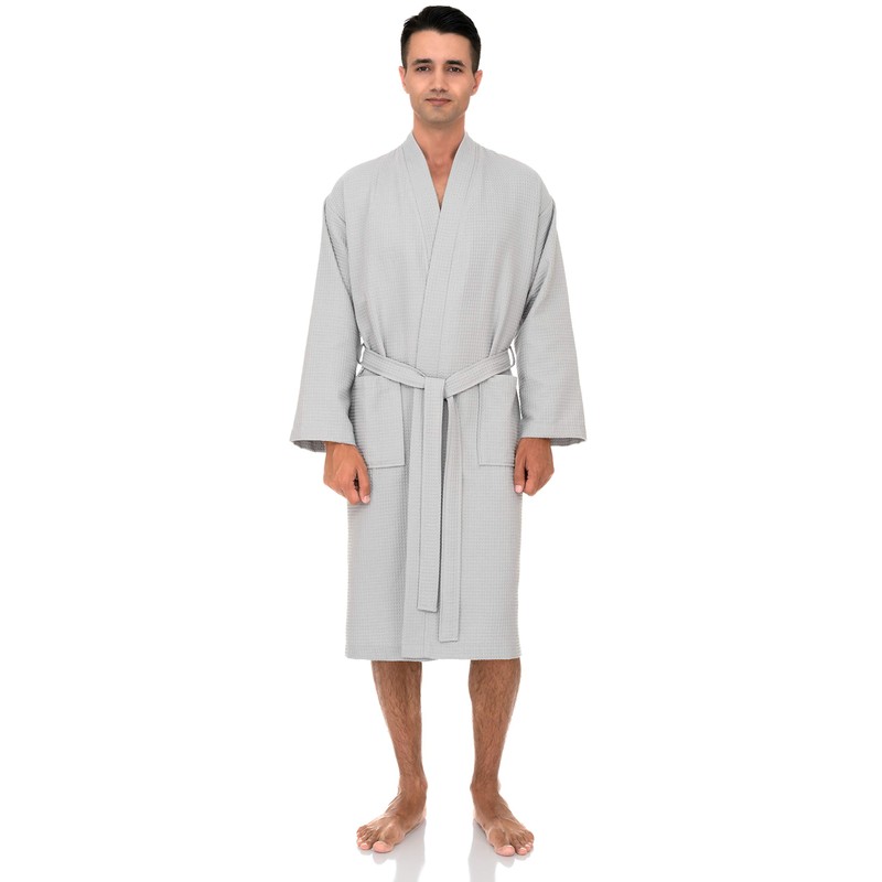 • Kimono Waffle Robe - Men's lightweight waffle robe. Kimono style spa bathrobe is perfect year-round, in any climate. This robe is lightweight, soft and comfortable. The comfortable kimono collar and arm hems are double stitched to improve strength, and two front pockets add to its stylish appeal. Featuring front pockets and a belt.
