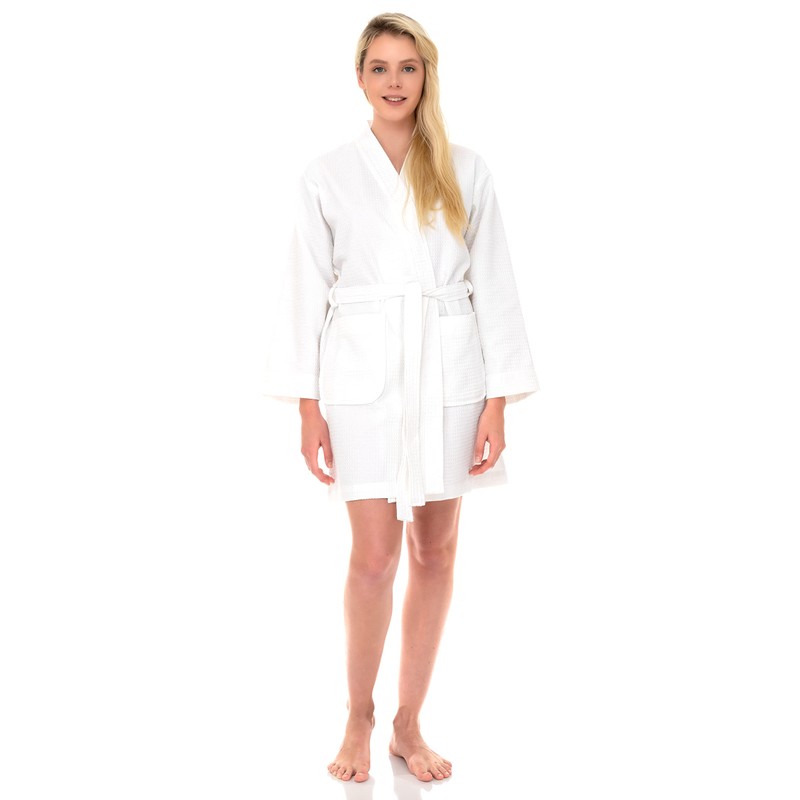 - Kimono Waffle Bathrobe - This waffle robe is lightweight and durable, especially great for pool, travel and gym. Travel with a robe is essential because yours is a perfect size, material, and fit for you. It is double stitched for durability. Featuring front pockets and a belt.