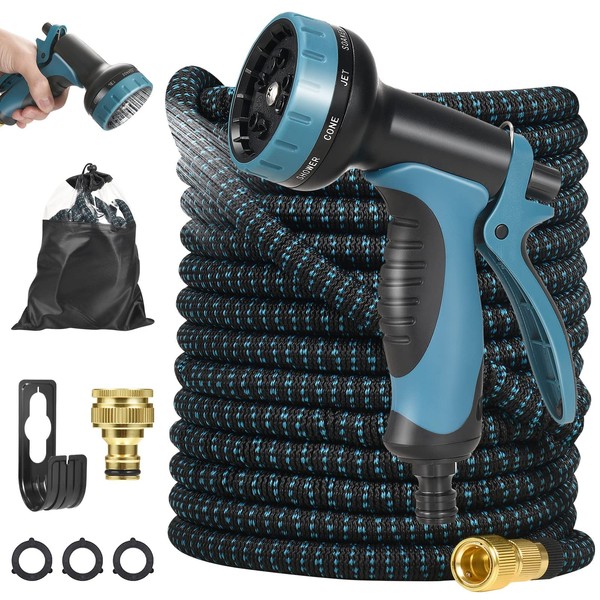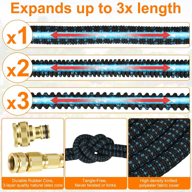 - ??????Ausziehbarer Schlauch??Wir bieten 2 verschiedene L?ngen von Gartenschl?uchen an, die L?nge kann 30 m/100 Ft und 15 m/50 ft erreichen, nachdem Wasser hinzugef1gt wurde. Der Gartenschlauch kann bei Nichtgebrauch auf 1/3 seiner L?nge gek1rzt werden. Machen Sie sich keine Sorgen 1ber Verwicklungen oder Knicke, sehr flexibel und leicht.