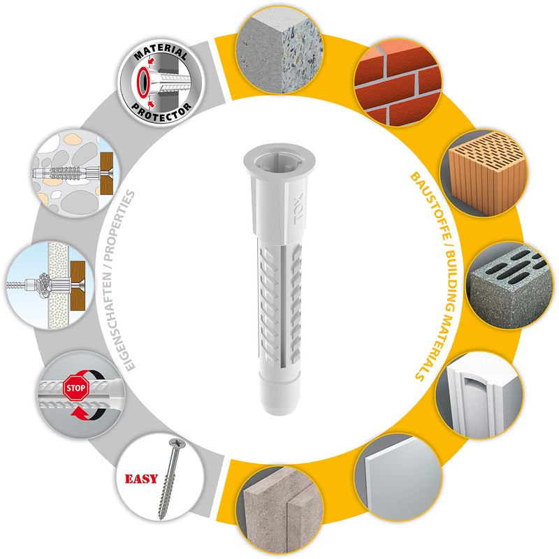 • The all-purpose dowel with 4-fold divided dowel body for even power distribution knots or spreads automatically depending on the building material
