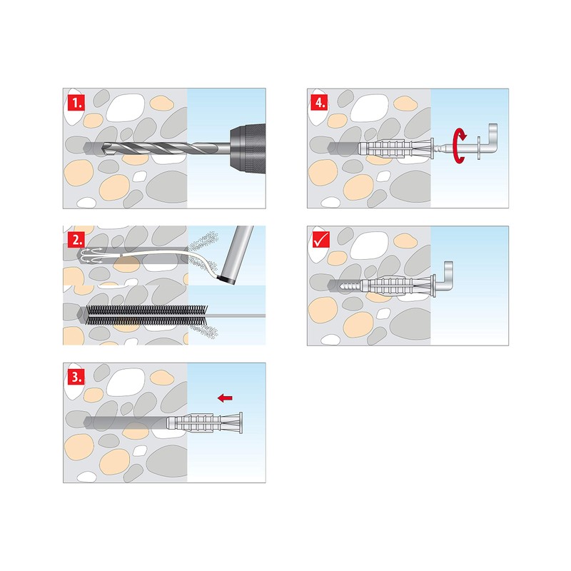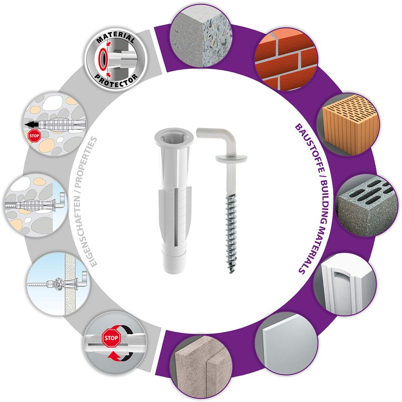 - Easy to install: the dowel can be easily inserted and mounted thanks to its triple divided dowel body and the dowel cap - the dowel cap protects the surface and prevents slipping deeper into the drill hole