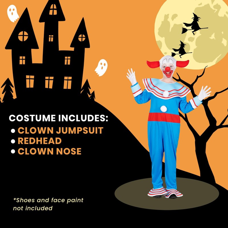 • INCLUDES: Clown jumpsuit with frilly collar and ankle cuffs and adorned with pom pom buttons. Comes complete with a red haired headpiece and clown nose.