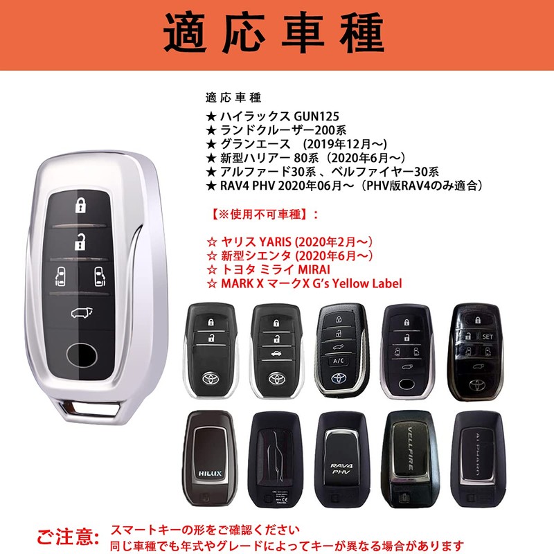 - [Compatible models] Crown Crossover 35 series (from September 2022), Crown Sport (October 2023), New Harrier 80 series (from June 2020), MXUA80 / MXUA85 / AXUH80 / AXUH80 / AXUH85, Prius 60 series, Hilux GUN125 Land Crew The 200 series. , RAV4 PHV 06/2020 ~ (Only compatible with RAV4 version), Grand Ace (December 2019), Alphard Vellfire 30 series, Early 2015 (2019), January ~ Late 2018 (Heisei 30), Alpha Vellfire 40. Family, GR Corrow. La and GR Yaris, etc. [Cannot be used for models]: Yaris Corolla, Sienta, Toyota Mirai Mark, X Mark X, G's Yellow Label Land Cruiser 300 series. Not suitable cause:Due to the different thickness of the key and the shape of the back of the key, it will not fit perfectly