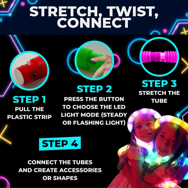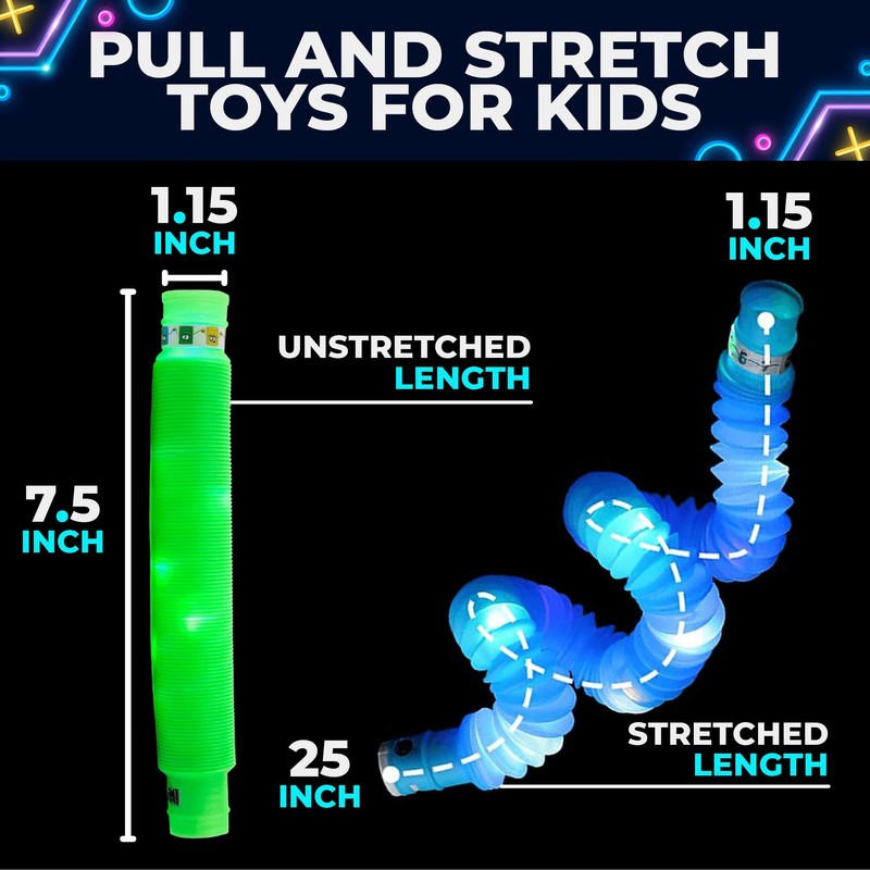 - Set of 24 Pop Tubes: Colorful pop tubes, with 6 vibrant colors (red, pink, orange, yellow, green and blue) to suit everyone's taste. Each tube measures 7.5 inches and can stretch up to 25 inches. Bring tons of fun and joy to your Neon Party with this light up toy set.
