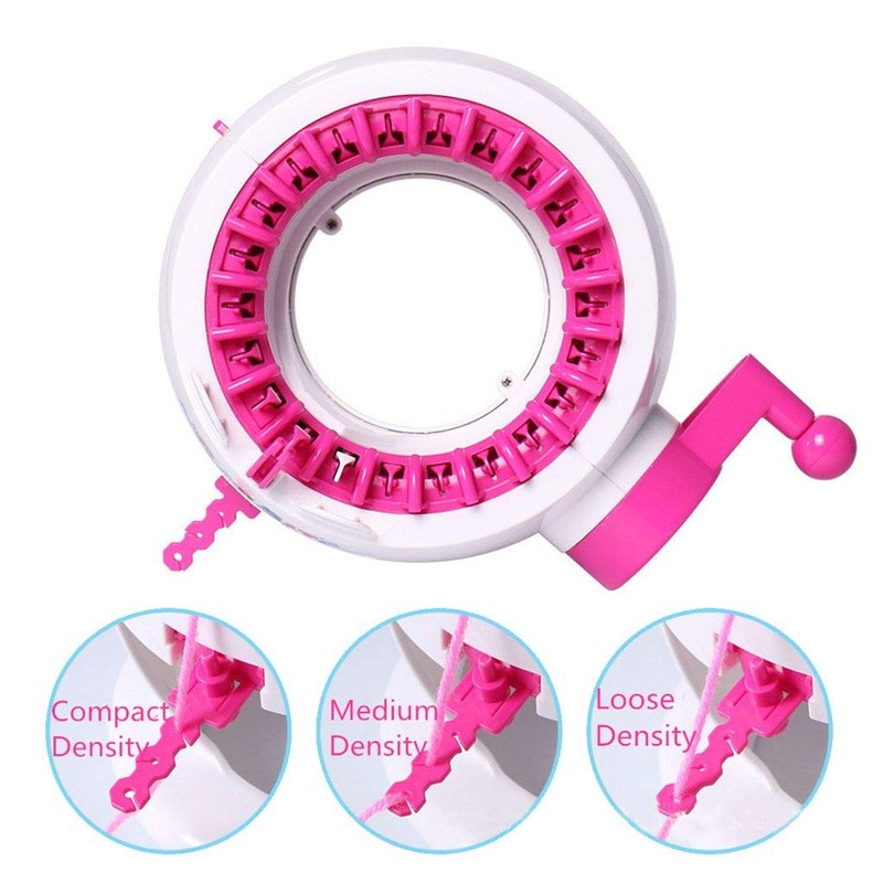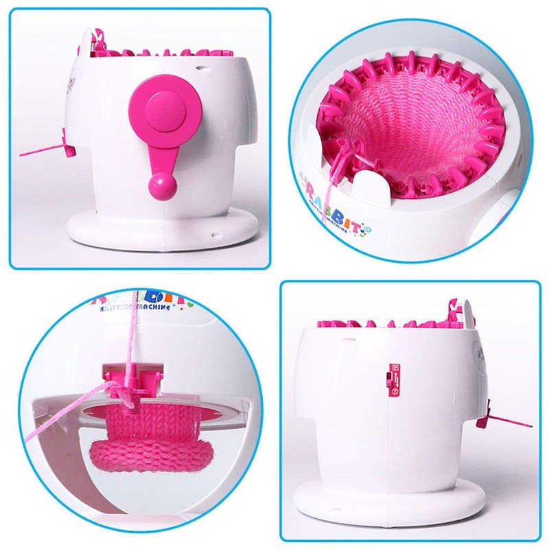 This children's knitting machine features adorable rabbit design and can create a flat or round stitch in seconds.