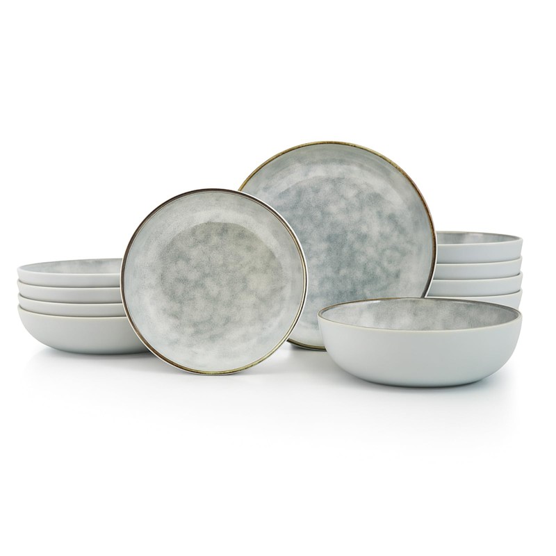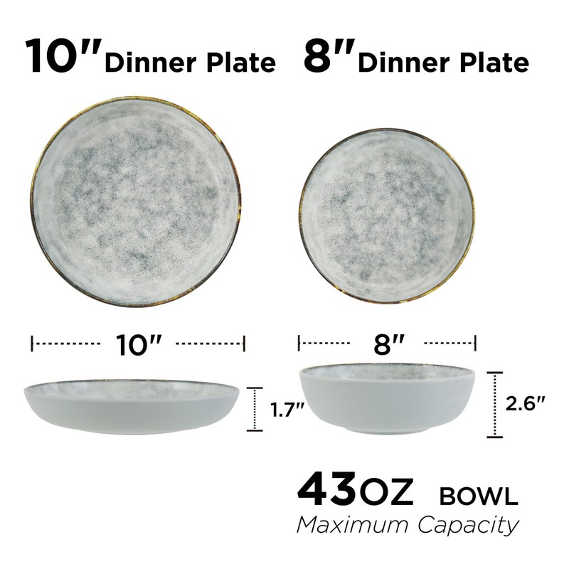 - Dinnerware Set for 4: Includes 4 each of 43 oz bowls, 10” dinner plates, 8” salad/dessert plates, featuring a speckled reactive glaze in shades of grey with a golden-grey rim — a charming addition to casual meals and formal gatherings.