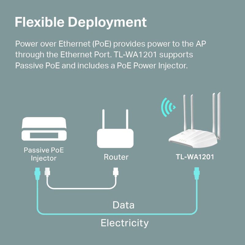• 【PoE for Easy Installation】TL-WA1201 supports Passive PoE power supplies, can be powered by the provided PoE adapter, making deployment effortless and flexible.