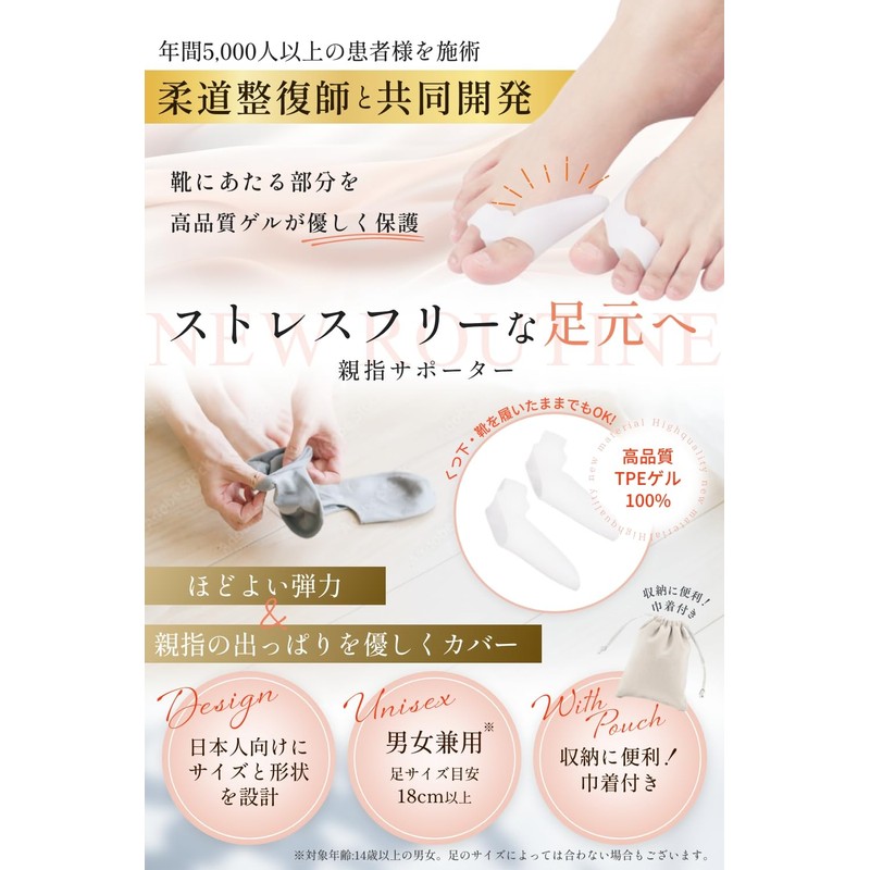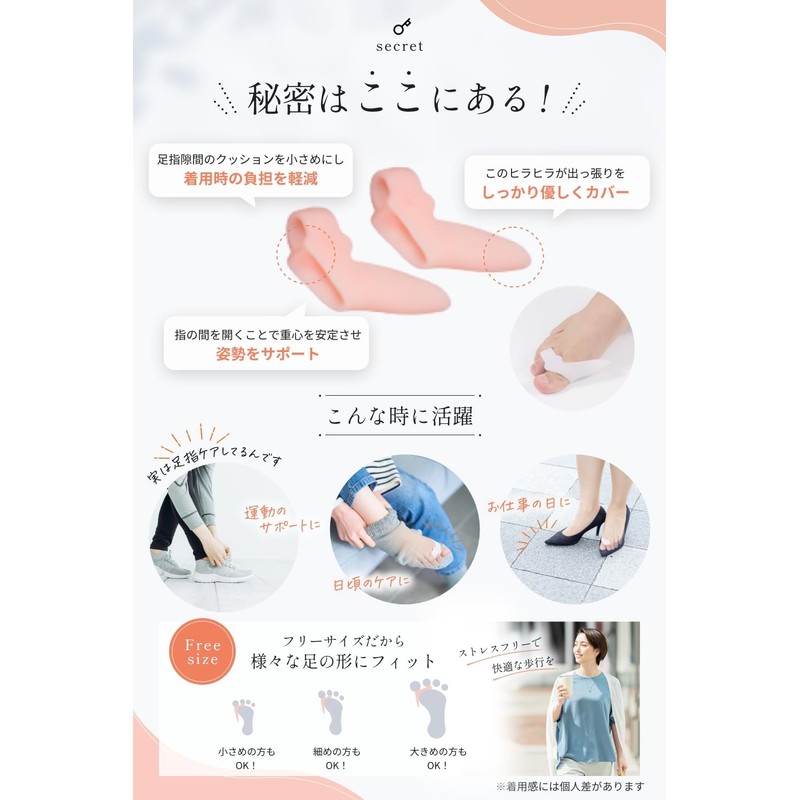 - 足サイズが22~27cmの方に適していて、中学生以上の男女であれば足指に着用することができます。足のサイズが小さめの方でも足囲や足幅が極端に短くない限り着用いただけます。