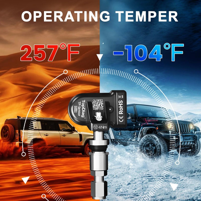 - High Power, Stronger, Faster Signal: TopDiag sensor tpms is not only fit for 315 MHz & 433 MHz frequency, compatible with 98% vehicle models, but also has IP67 waterproof rating and -104℉~257℉ operating temperature, so you can use this TPMS tire pressure sensor in almost any weather.