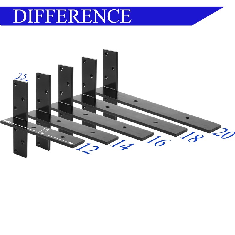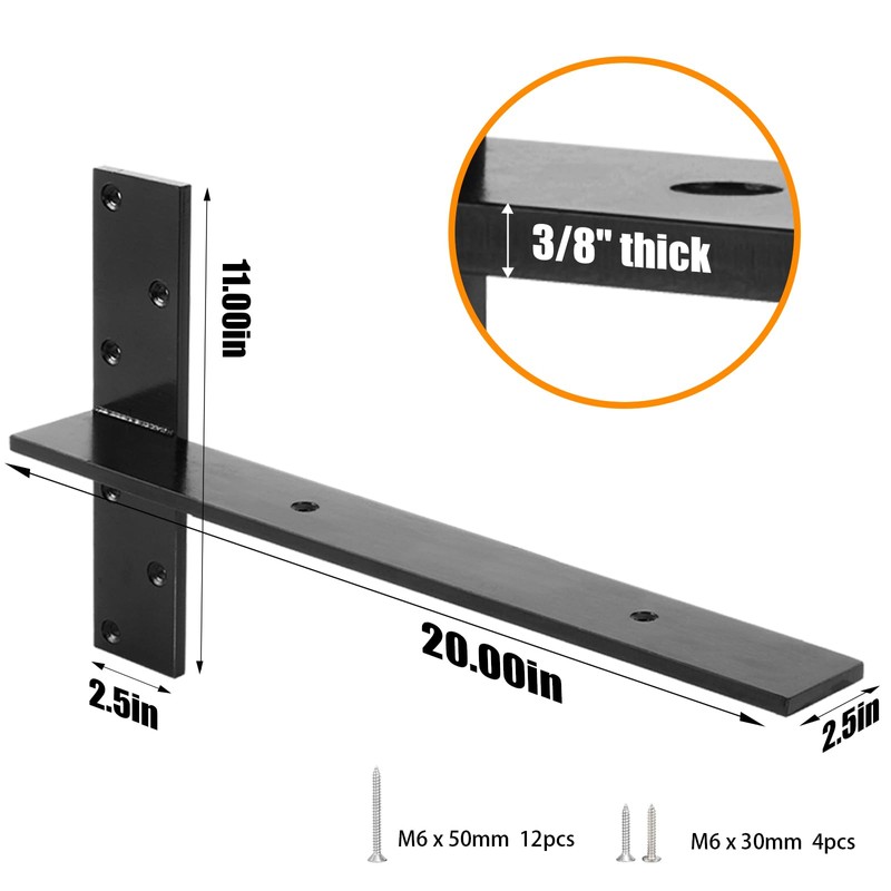 - Specifications: Package includes 2 pack T shelf bracket, 16 pcs screws; 3/8" thick by 2-1/2" wide, 20" length (exposed length after hidden installation is 17.5"). Vertical length is 11", width of 2-1/2"