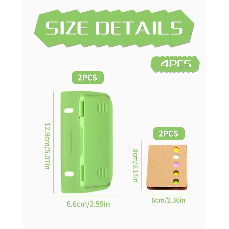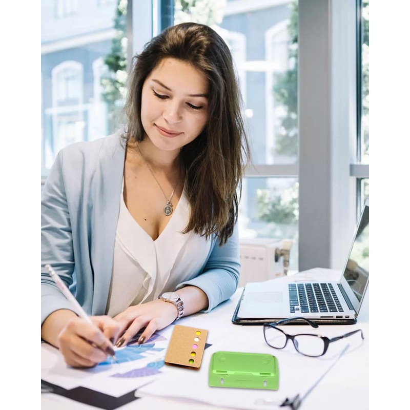 - PRODUCT PACKAGING You will get 2 x green hole punches and 2 x mini sticky notes for organizing documents in school or workplace. This is the ideal tool for punching paper, documents or sticky notes.