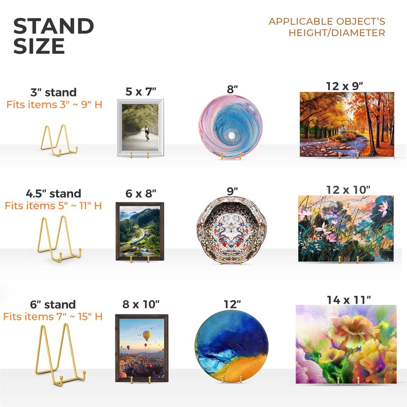 - CHOOSE YOUR PERFECT STAND: - 4.5-inch small decorative plate stand fits for item of 5″ ~ 11″ Height / Diameter, Lip Depth: 1-1/5". 6-inch picture stand fits for item of 7″ ~ 15″ Height / Diameter, Lip Depth: 1-1/4".