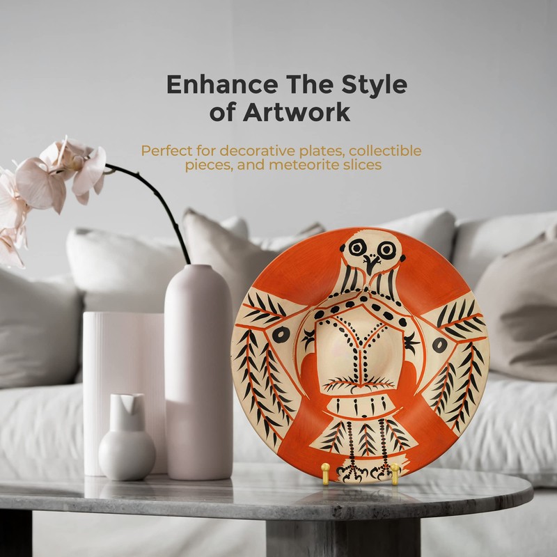 - SMALL BUT STURDY DESIGN: - This plate display stands has a matte gold powder-coated finish and wrought iron construction, strong enough to hold decorative plates, painted tiles, plaques, photo frames, platter, pictures, book, canvas, dishes, etc.