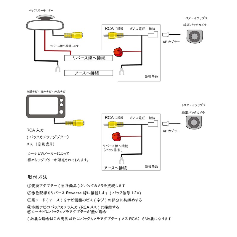 - Converts genuine Toyota / Daihatsu / Eclipse rear camera 4-pin wiring to RCA terminals for external navigation