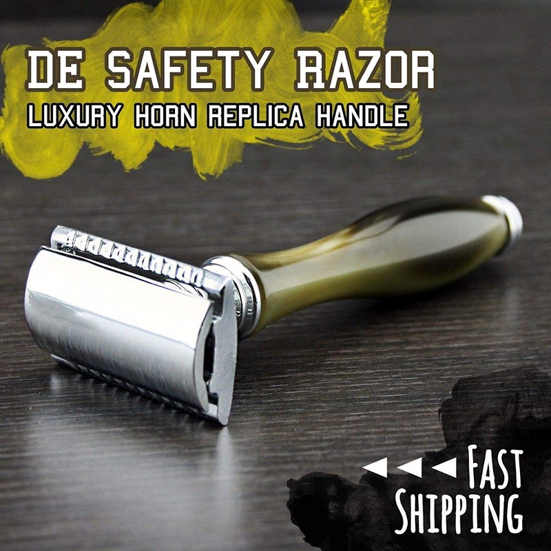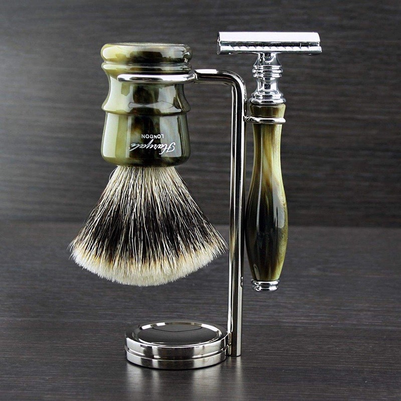 Traditional Silver Tip Wet Shaving Horn Set > Silver Tip Badger Shaving Brush & Classic DE Safety Razor - Luxury Horn Replica Resin Handles>Modern Shaving Classics by Haryali London - Great Gift Idea
